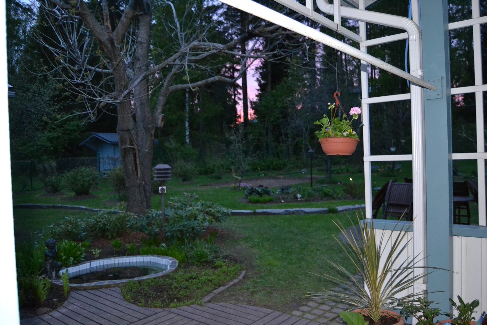 Illalla puutarha on kaunis..valo tulee puiden välistä ja luo erillaisia sävyjä.