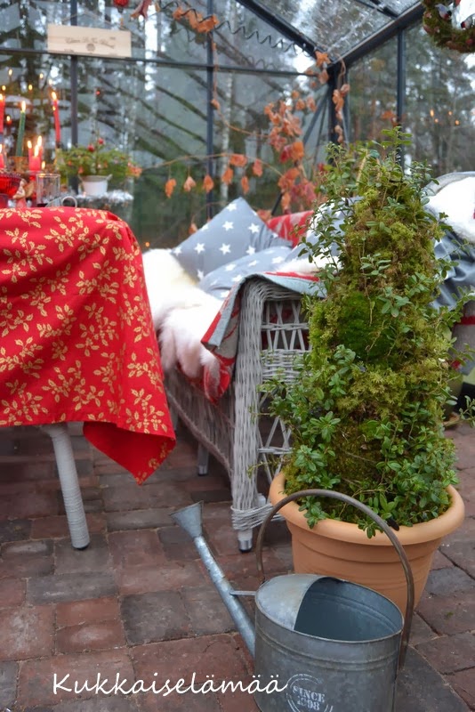 7. Aina ei ole kiva olla karvakuono, mutta ehkä pukki muistaa jollain mieluisalla lahjalla! Hyvin jouluinen tunnelma teillä kasvarissa, vain lumi puuttuu. Nyt on hiukan "englantilainen" tunnelma puutarhassa. 😉