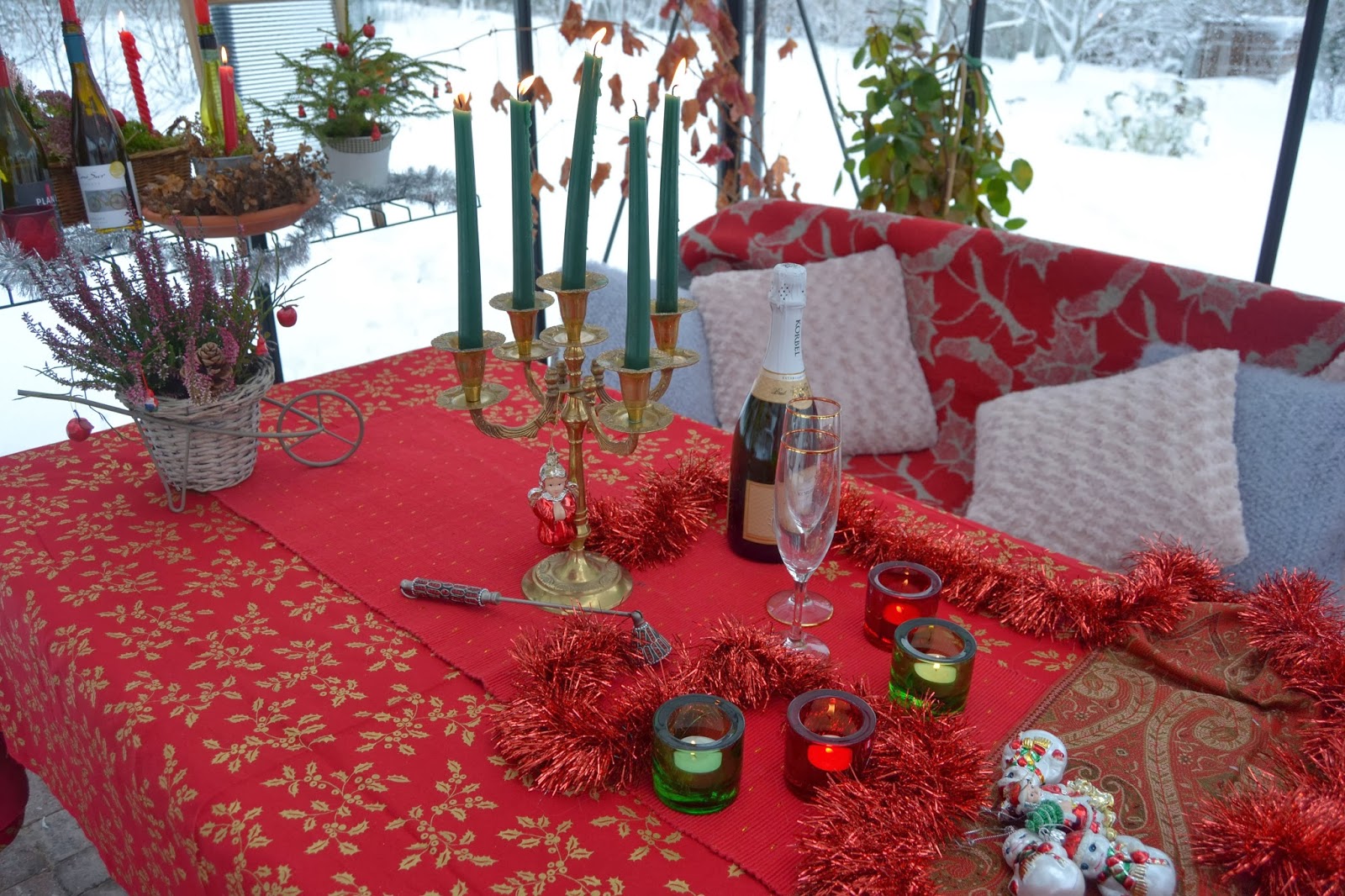 20. Iiik, miten ihanan jouluinen kasvihuone! Oli varmasti mukavaa viettää juhlahetki viinin kera noissa tunnelmissa:) Ja niin paljon olet jaksanut laitella kaikkea kaunista sisustukseen:)