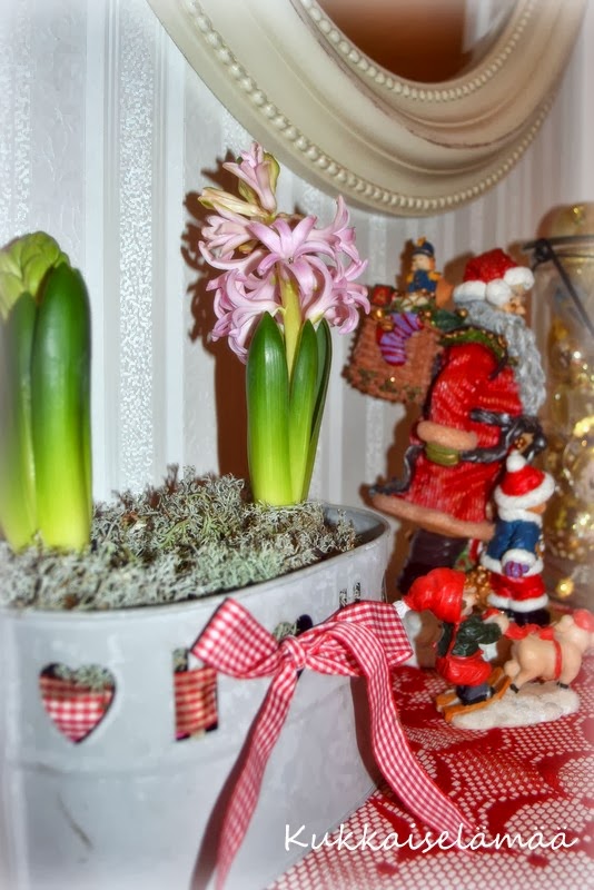 Tämä tapahtuu joka vuosi. Tapaninpäivänä iskee totaalinen kyllästyminen jouluun ja hiljaiseloon. Kaikki koristeet ja joulukuusi alkavat ärsyttää. Joudun todellakin hillitsemään itseäni, etten vie kaikkia samantien varastoon odottamaan seuraavaa joulua. Haluan kevään! Nyt ja heti! Sisäinen puutarhurini herää aina tapanina ja iskee talvimasennus. Eniten tässä masentaakin se, ettei talvi ole vielä edes alkanut. Olen vakaasti sitä mieltä, että lumen määrä per talvi on vakio. Ja koska sitä ei ole vielä tullut, kohta tulee ja paljon – taatusti joka päivä. Ja varmaan siitä lumesta saamme nauttia aina vappuun asti. Olen yrittänyt lääkitä kukkakaipuutani parhaani mukaan sisätiloissa… This happens every year! On the 26th of  December I’m ready to leave Christmas behind me. I’ve got tired of all the decorations and I have to control myself not to carry all the decorations to the garage… I want spring and gardening season to begin! Right now! My inmost gardener has waken up! I get depressed, because the winter hasn’t even begun yet. We don’t have any snow. I’m sure that every winter, the amount of the snow is the same, so because there isn’t yet any snow, there will be – a lot and maybe we’ll be able to enjoy it still in May… I’ve tried to heal my gardening yearning by having a lot of flowers indoors…