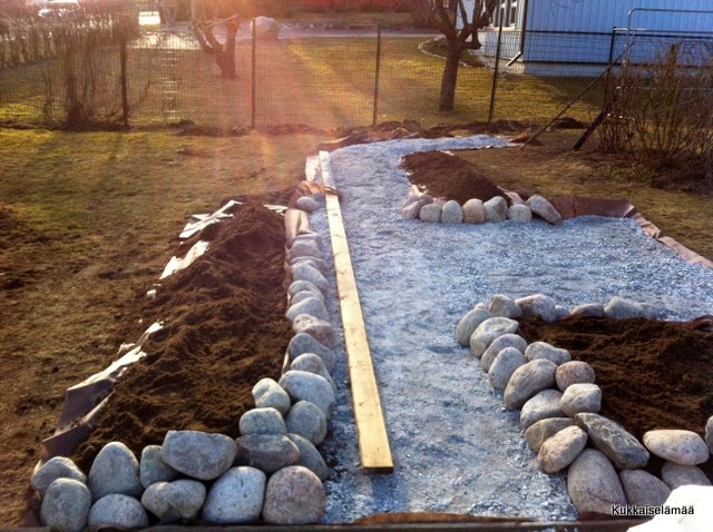 Eilen illalla maanpeitekangas loppui heti alkuun ja homma piti lopettaa. Asettelin kokeeksi noita kivenjärkäleitä ja nyt kun katson niitä, tyydyn yhteen kerrokseen kiviä. Näyttää sekavalta, jos ovat kahdessa kerroksessa. Tuosta taas tulee se ongelma, että miten saan mullat pysymään kivien sisäpuolella, etteivät valu polulle. Pitänee fiksailla jotenkin kankaalla…