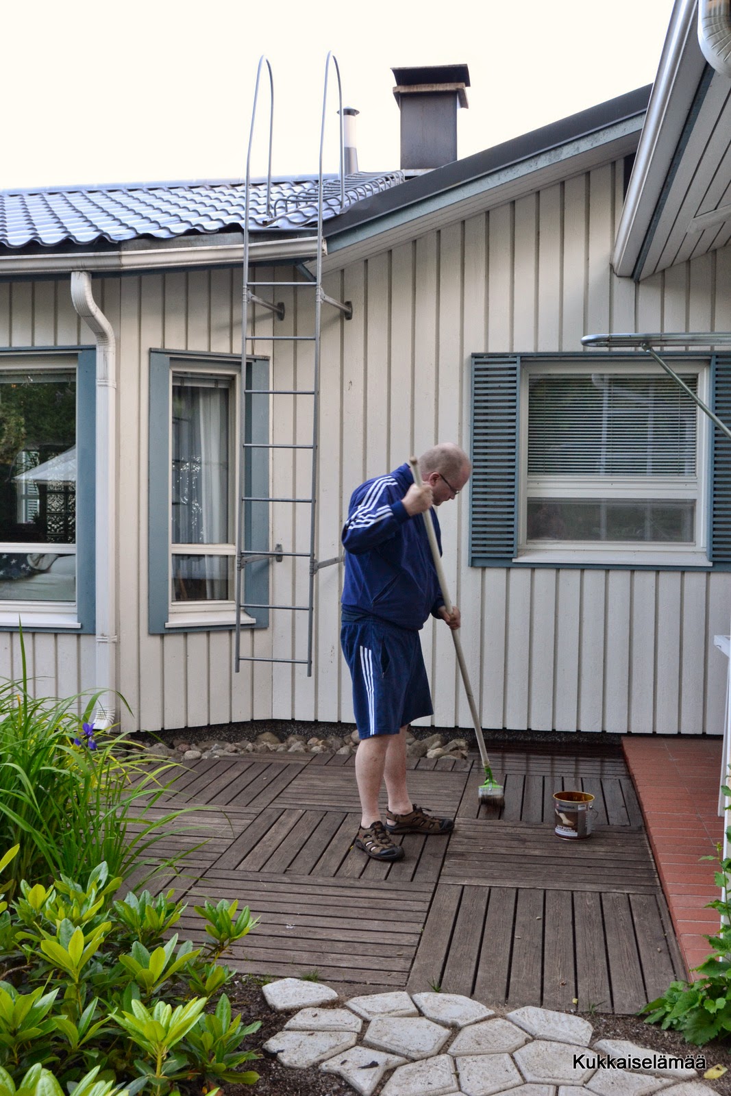 Aiemmin mieheni pesi terassin Bayerin Terrace Clean –pesuaineella. Sain aineenBayeriltakokeiltavaksi blogiyhteistyönä. Tuote on valmistettu biologisesti hajoavista ainesosista. Aine sekoitetaan veteen ja suihkutetaan pestävälle pinnalle. Mieheni pesi terassin karkealla pesusienellä. Lopuksi huuhdellaan. Nyt kun terassi on jo kuivunut, mieheni käsitteli kauhtuneen laudoituksen puuöljyllä. Onpa taas siistimpi jonkin aikaa.