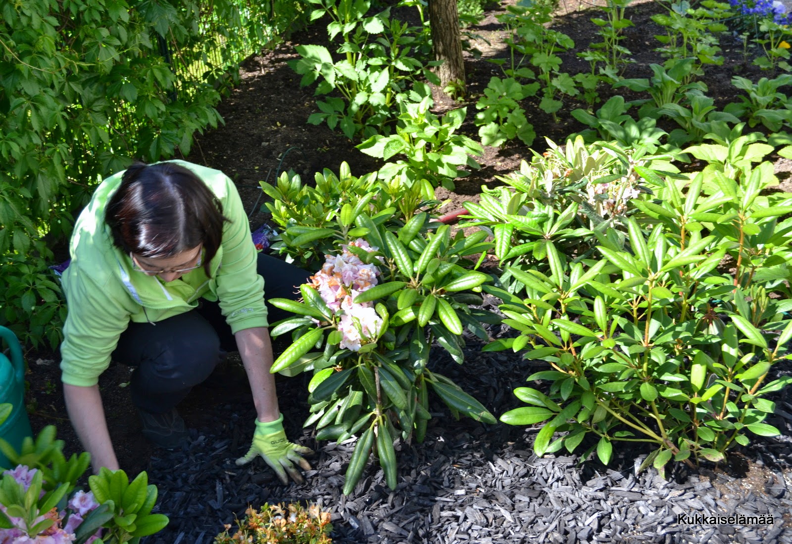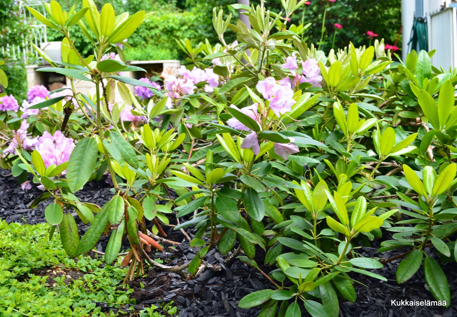 Mulla on osa alppiruusuista oikein ison puun alla, ja varmaan kärsivät siitä, sillä puu vie kaiken ravinnon. Siksi pitää lisätä säännöllisesti rodomultaa ja lannoittaa nitä.