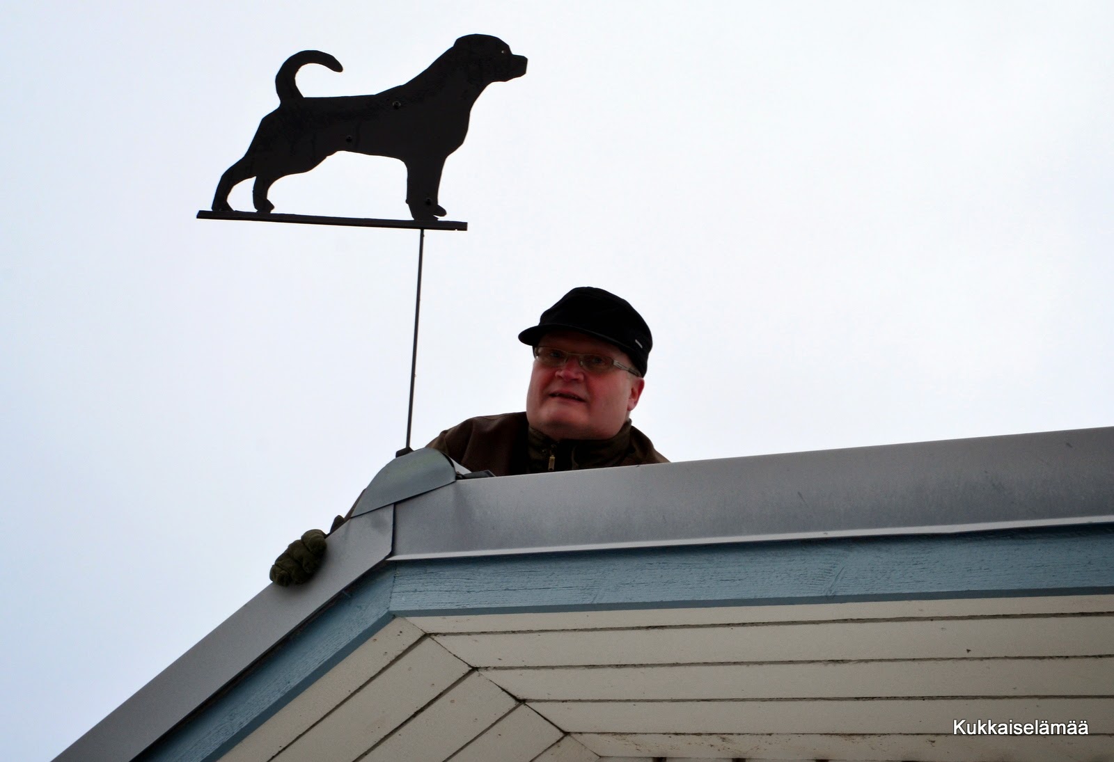 Mutta hei, ei oo Mikilläkään helppoo! Raukkaparka ei uskalla enää ulkoilla meidän etupihalla. No, miksi? Siksi, että huomasi Rottweiler-tuuliviirin katolla. Mikki haukkuu viiriä ja juoksee etuoven eteen portaille piiloon. Yksin ei Mikki enää suostu etupihalle menemään. Ulkoilee takapihalla.