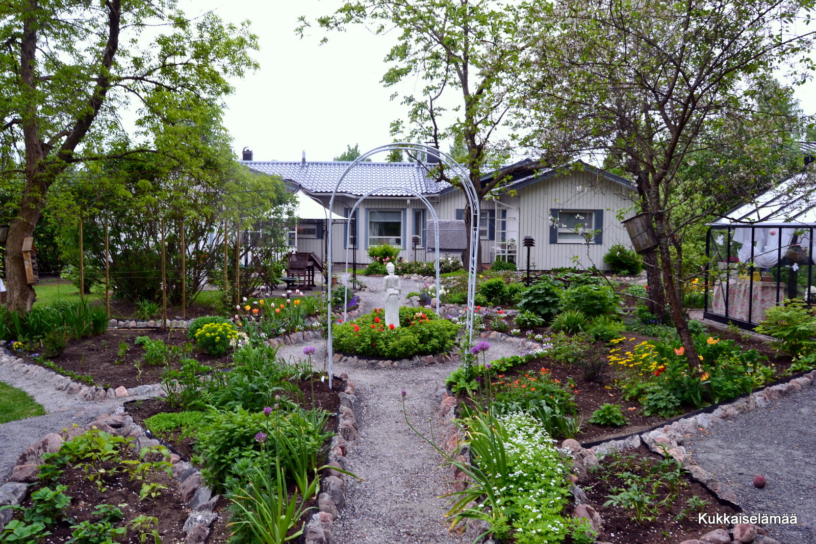 Kirsikoitten kukinta on ohi. Tarha-alpi patsaan ympärillä nousee lupaavasti. Tuohon patsaan ympyräpenkkiin olen tosi tyytyväinen. Ensin kukkivat tetet. Kun ne lakastuivat, kukkivat tulppaanit ja nyt, kun tulput alkavat olla ohi, nousee alpi. Ei huono!