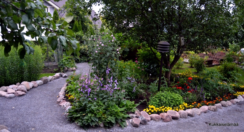 Minä olen ihastunut tuohon leimurakkauteen, joka kukkii vasemmalla valopylvään takana. Sopii mielestäni loistavasti sinisen loistosalvian viereen, ja kukkivat yhtä aikaa. Noita pitää vielä asetella syksyllä lähemmäs toisiaan ja levitellä. Nyt noitten välissä on kitukasvuinen chili.