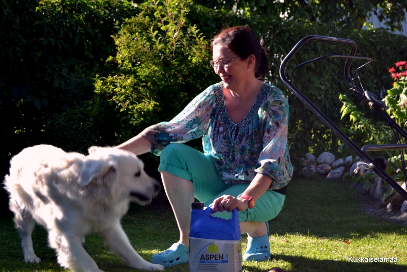 Ja sitten testiin… Mikki oli enemmän kuin innokas apuri ruohonleikkuuseen. Kun otin kanisterin esiin, Mikki oli ihan ”liekeissä”.