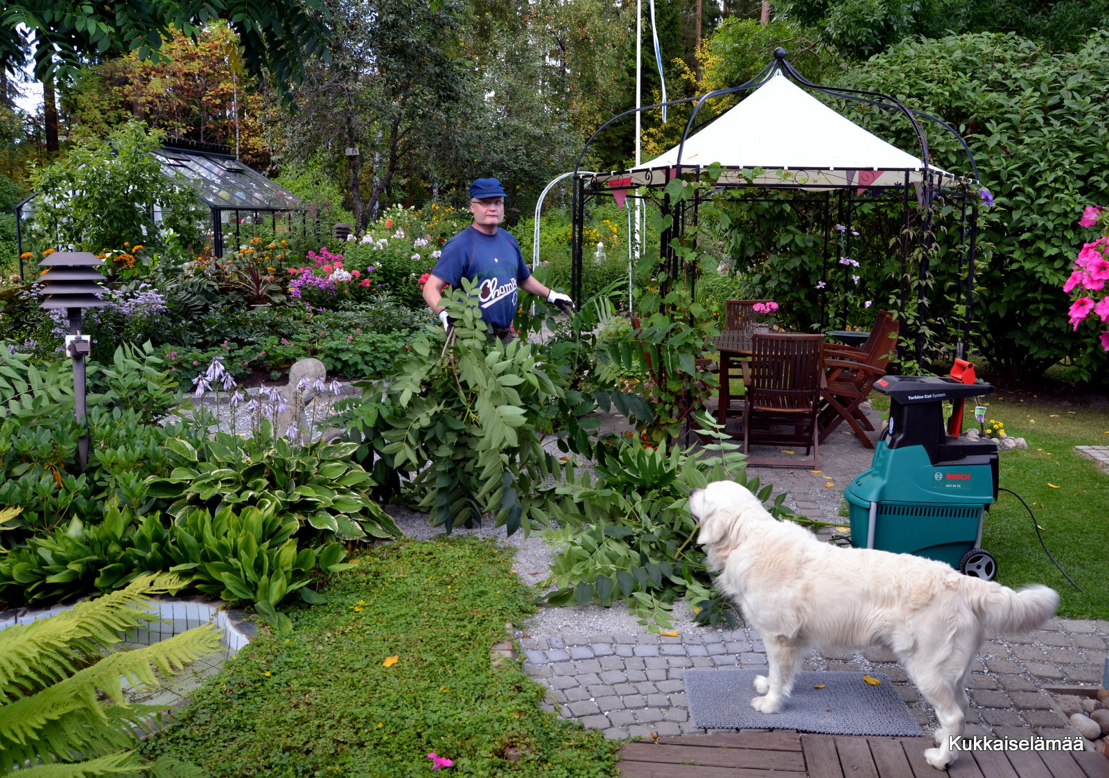 Mitä tuostakaan kuvan haketushommasta tulisi ilman Mikkiä? Ei yhtikäs mitään. Mikki valvoo laatua ja on virallinen Kukkaiselämän puutarha-apulainen. Se on vaativa pesti se!