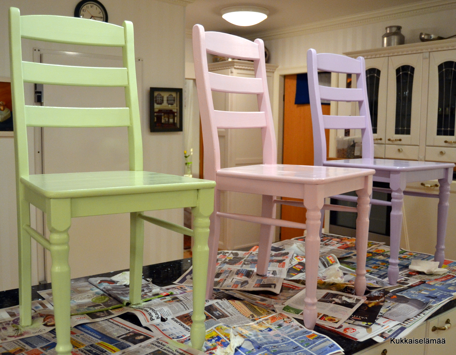 Kun ei voi kuukausitolkulla mennä jalan vuoksi lenkille ja pitää vain viikonloppunakin istuskella kotona, alkaa tehdä mitä ihmeellisempiä juttuja. Minä aloin sisustamaan, mitä teen melko harvoin. Sain sunnuntaina extempore-idean maalata vanhat mäntytuolit ja tuoda ne vaihteeksi keittiön ruokapöydän ääreen. Tuumasta toimeen!