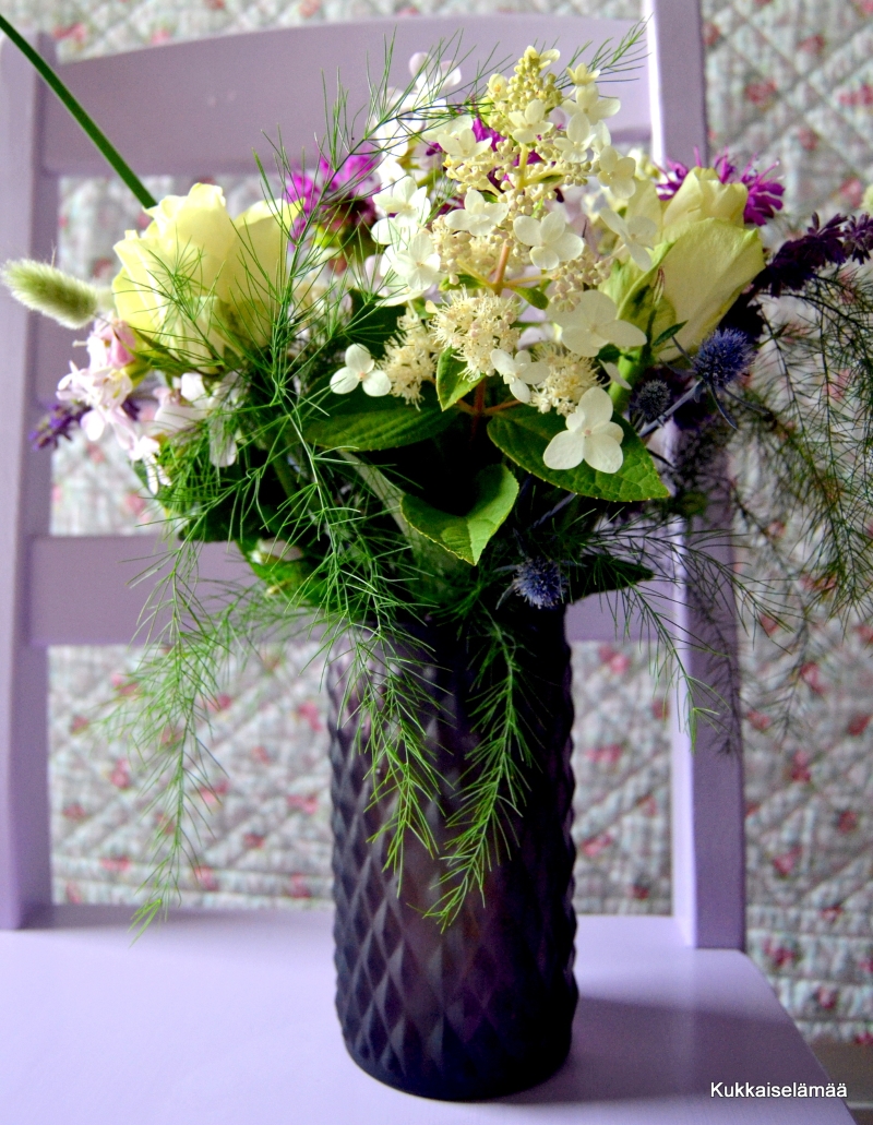 Hei! Jo on aikoihin eletty! Olen raaskinut poimia kukkia puutarhasta oikein urakalla. Sisäinen ”Kukkanaiseni” on päässyt valloilleen ja kukkakimppuja syntyy. Alla taas muutamia. Täydensin puutarhamme kukka-antia kaupan valkoisilla ruusuilla. Tyttäreni otti suurimman osan näistä kuvista. Hi! Something weird has been going on… I’ve picked up many flowers from our garden. I’ve made flower bouquets. Here you can see, what I made. All the flowers – except roses – are from our garden. The most of the pictures were taken by my daughter.