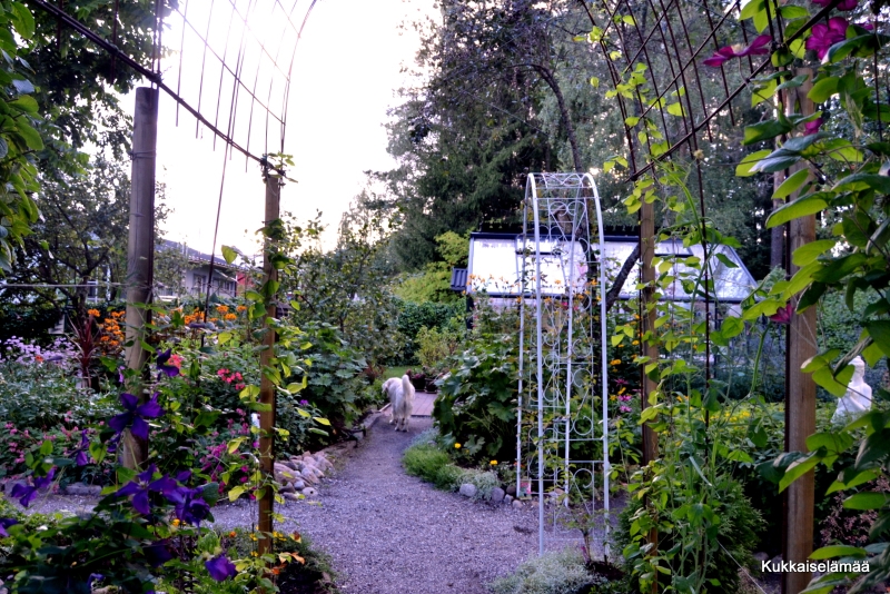 Heips! Viimeistä lomaviikonloppua viedään. Maanantaina palaan töihin. Puutarha ja bloggailu voivat taas jäädä vähän vähemmälle ja kiirettä pukkaa. Siinä muutosta elämään. Muutosta on myös tuloillaan puutarhaan… Olen Mikin innoittamana alkanut innostua havuista puutarhaan. Tähän asti meillä ei juurikaan ole ollut niitä juuri Mikin vuoksi. Jos hauveli nostaa koipea havulle, tulee keltaista ja kuollutta jälkeä. Yllättäen Mikki on antanut olla kaikkien havujemme merkkailuiltaan rauhassa ja havut voivat hyvin. Niinpä havukasveja piti saada lisää. Talvi ei tunnu niin ankealta, jos puutarhasta pilkistää edes jotain paljaitten puiden lisäksi. Hankin eilen kaksi isohkoa pallotuijaa. Ihailen suuresti perinteisten puutarhamaiden muotoonleikattuja puksipensaita yms. No, pallotuijat saavat ajaa meillä saman asian. Hi! It’s been my last free week and holidays from my work. Yesterday, I was gardening with my mom and Mickey. It was a great day. I made some changes in our garden. I bought two Thuyas and I hade to make them some place. Before I could plant them, I had to move many plants… After gardening I took pictures in the evening light.