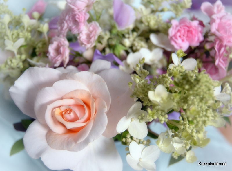 4. Voi, kun osaisikin ommella noin hienoja ja istuvia vaatteita! Kauppojakin välttelen viimeiseen asti, sitten menen ja ostan useamman saman tien, ettei tarvii ihan heti mennä uudestaan – en siis ole shoppailuihminen! Mikähän tuo ihana persikan värinen ruusu on nimeltään, on niin kaunis! Muutenkin kimppusi ovat olleet ihania!