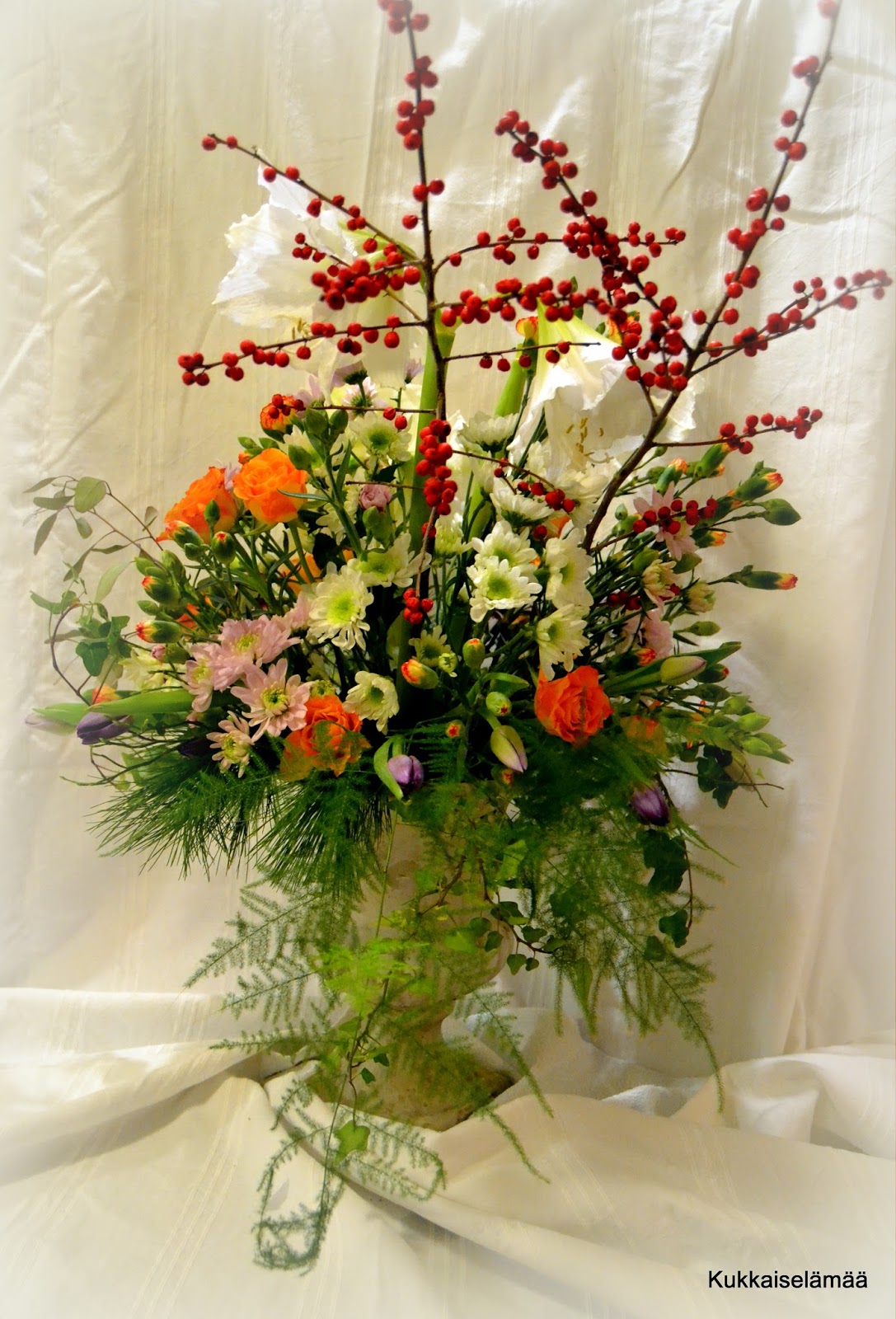 Uudistin viikko sitten tekemäni asetelman uusilla kukilla. Vanhaa ovat vain amaryllikset ja nuo punaiset marjaoksat. Tuunasin asetelman uusiksi kahdenlaisilla neilikoilla, krysanteemeilla, liloilla tulppaaneilla ja räväkän oransseilla ruusuilla. Käytin siis vastavärejä ja rauhoittavana värinä valkoista.