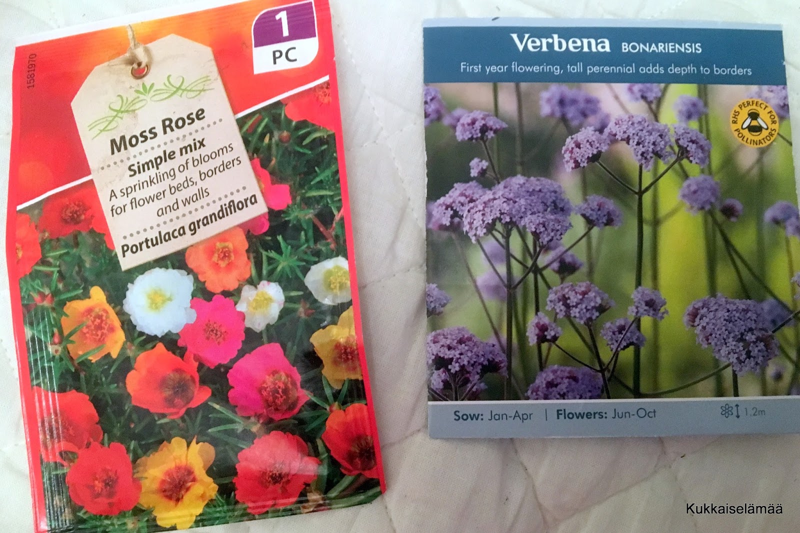 Portulakkaa olen joskus kasvattanut ihan hyvällä menestyksellä. Viihtyy lämmössä. Jättiverbena on perhosmagneetti. Sitä kylvin jo. Kylvös on kylmiössä vielä muutaman viikon.