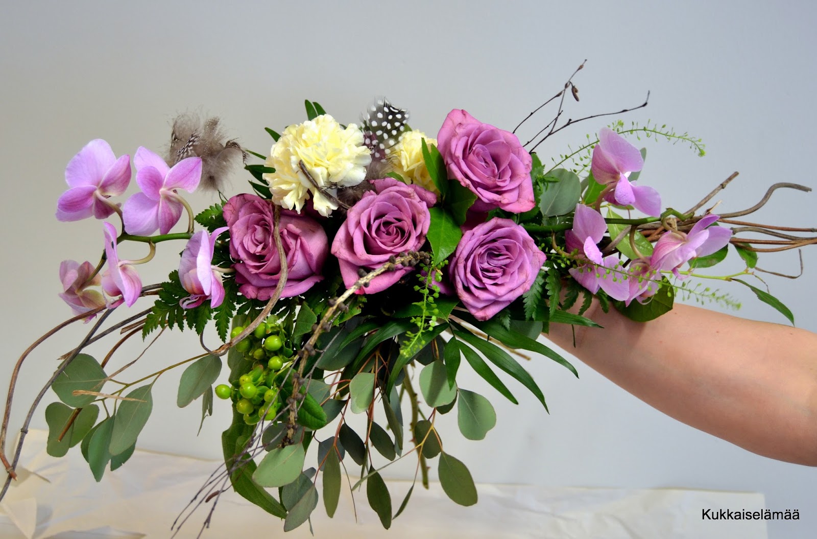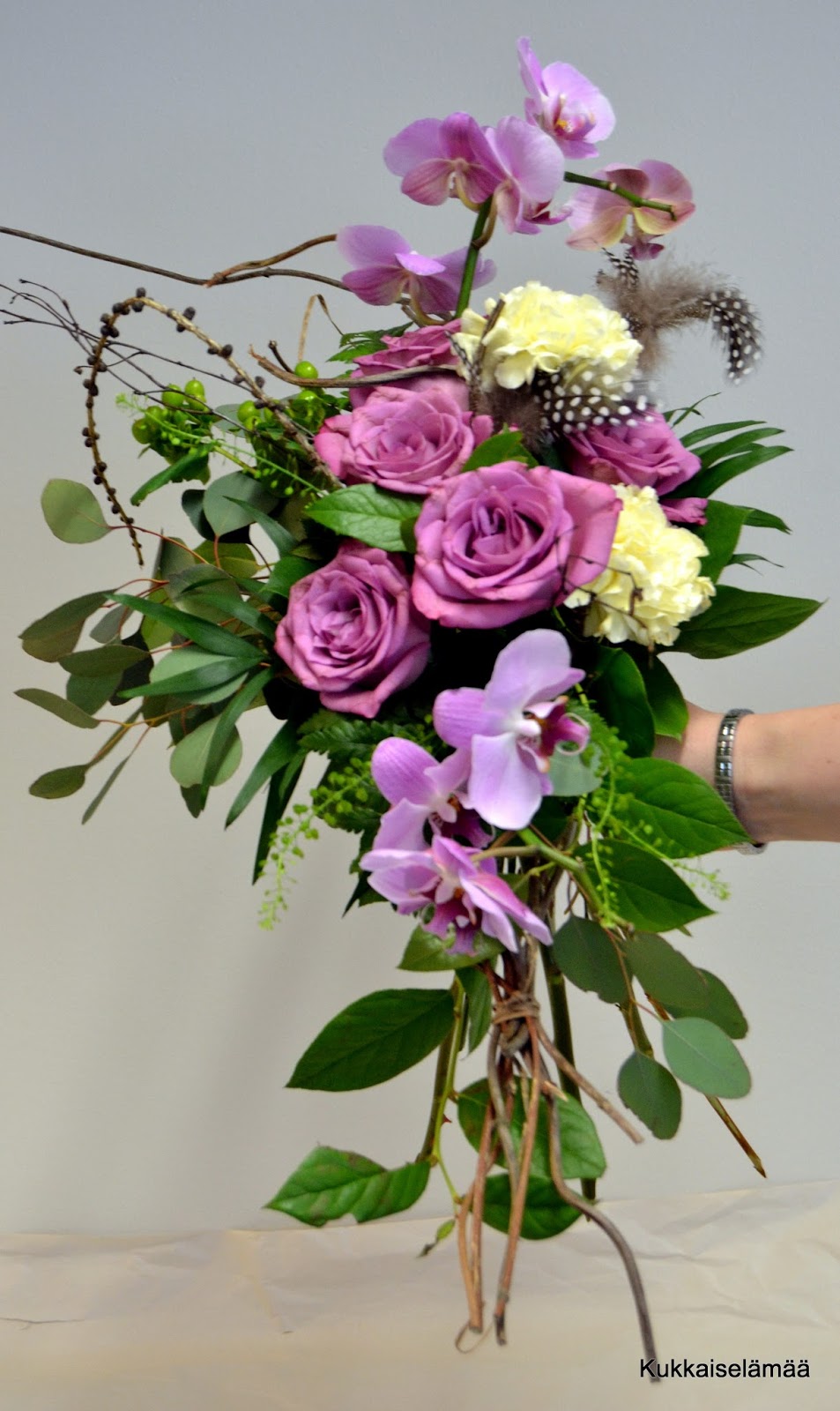 Kukkasidontakoulutuksen päivän teemana oli boheemi hääkimppu! Oli kyllä yllättävän vaikea tehtävä. Päässäni oli selvät sävelet, miltä kimpun pitäisi näyttää. Tekeminen ei sitten ollutkaan niin selvää. Isoa kimppua on haastellista hallita ja tehdä. Meillä ei ole luokassa peiliä, joten kimppua pitää pyöritellä nähdäkseen sen joka suunnasta.