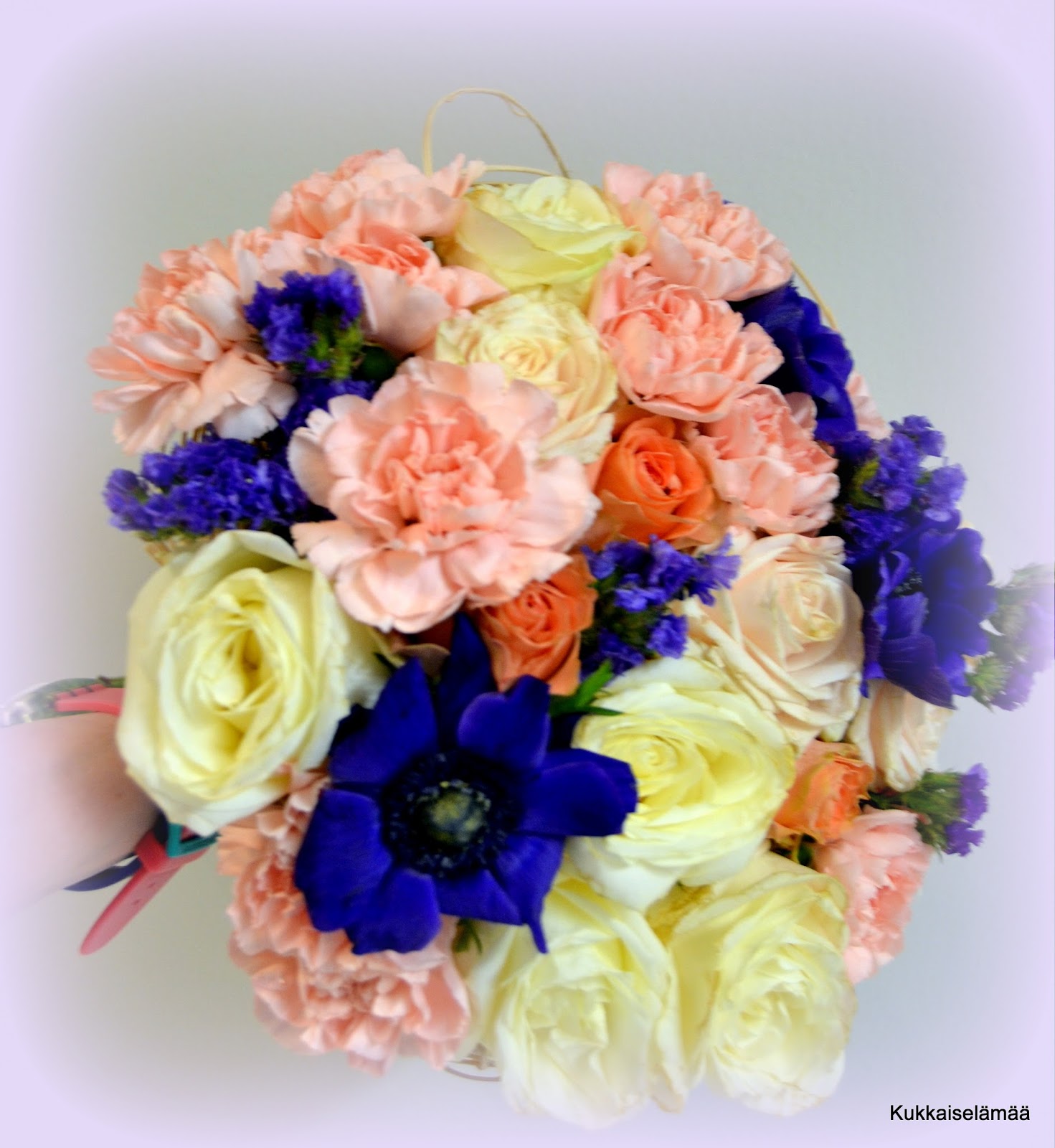 Hei! Olipa taas hyvä ja opettavainen päivä. Olin jälleen mukana Sampon viheralan opiskelijoitten kukkasidontakoulutuksessa, jota piti floristimestari Anna Utti. Päivän teemana oli surulaite.