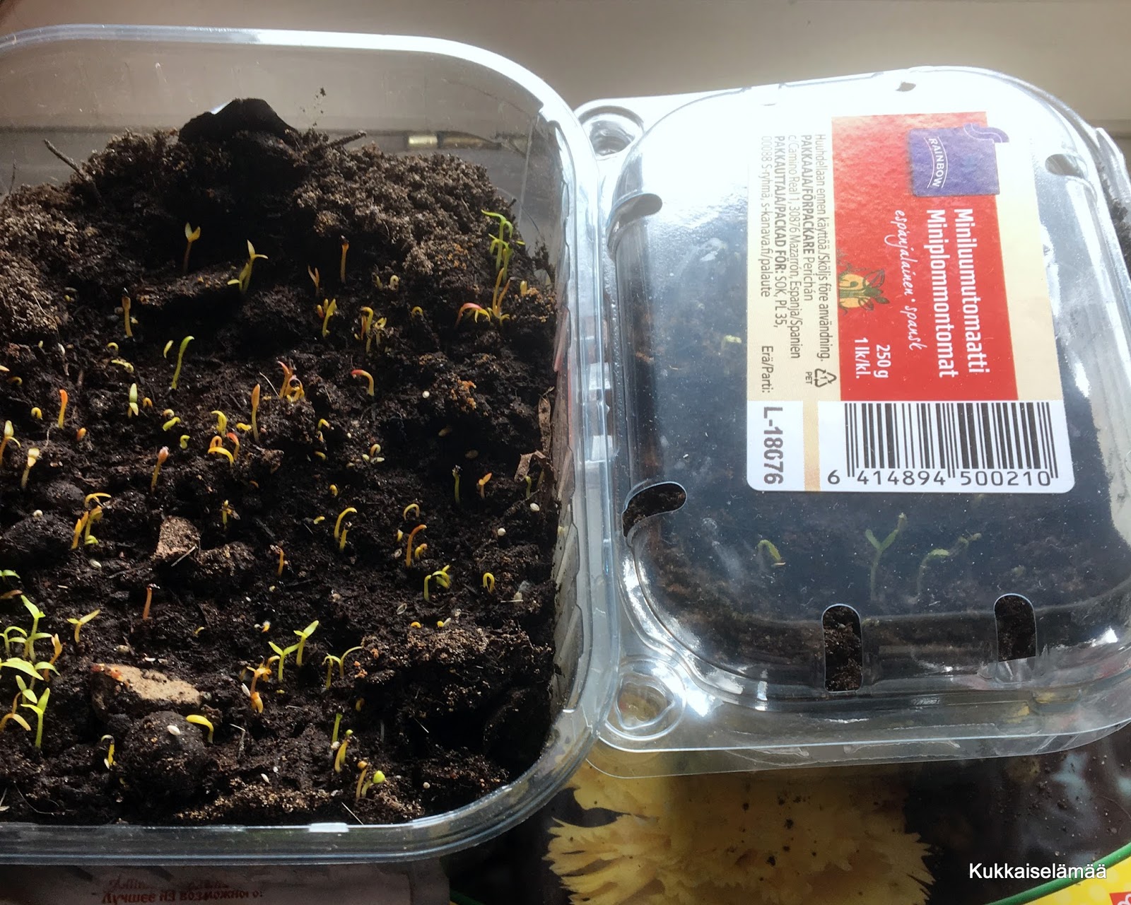 Sillä välin kun olin Harjussa, olivat uusimmat kukkakylvökseni itäneet hienosti. Neljässä päivässä. Kukkaa pukkaa!