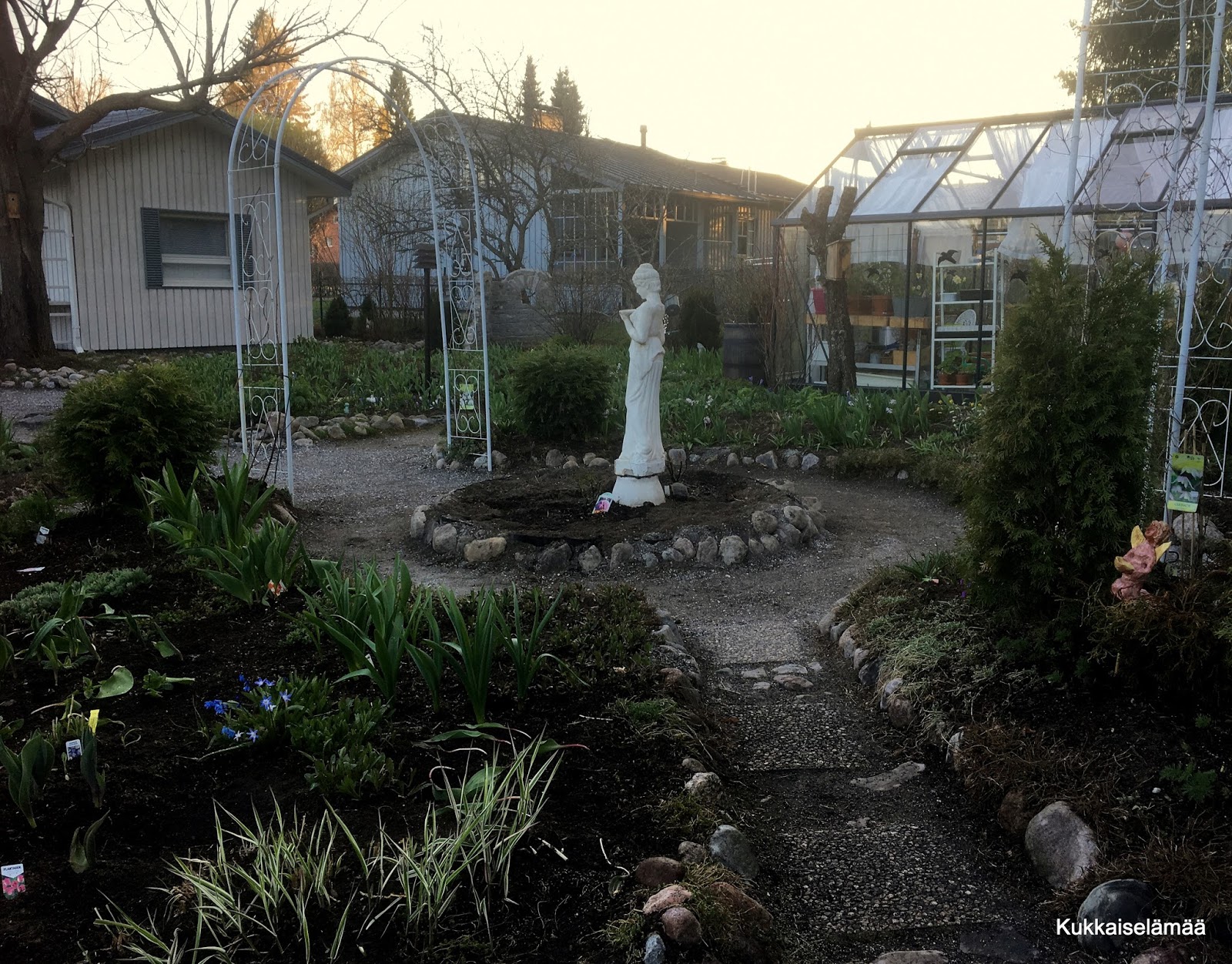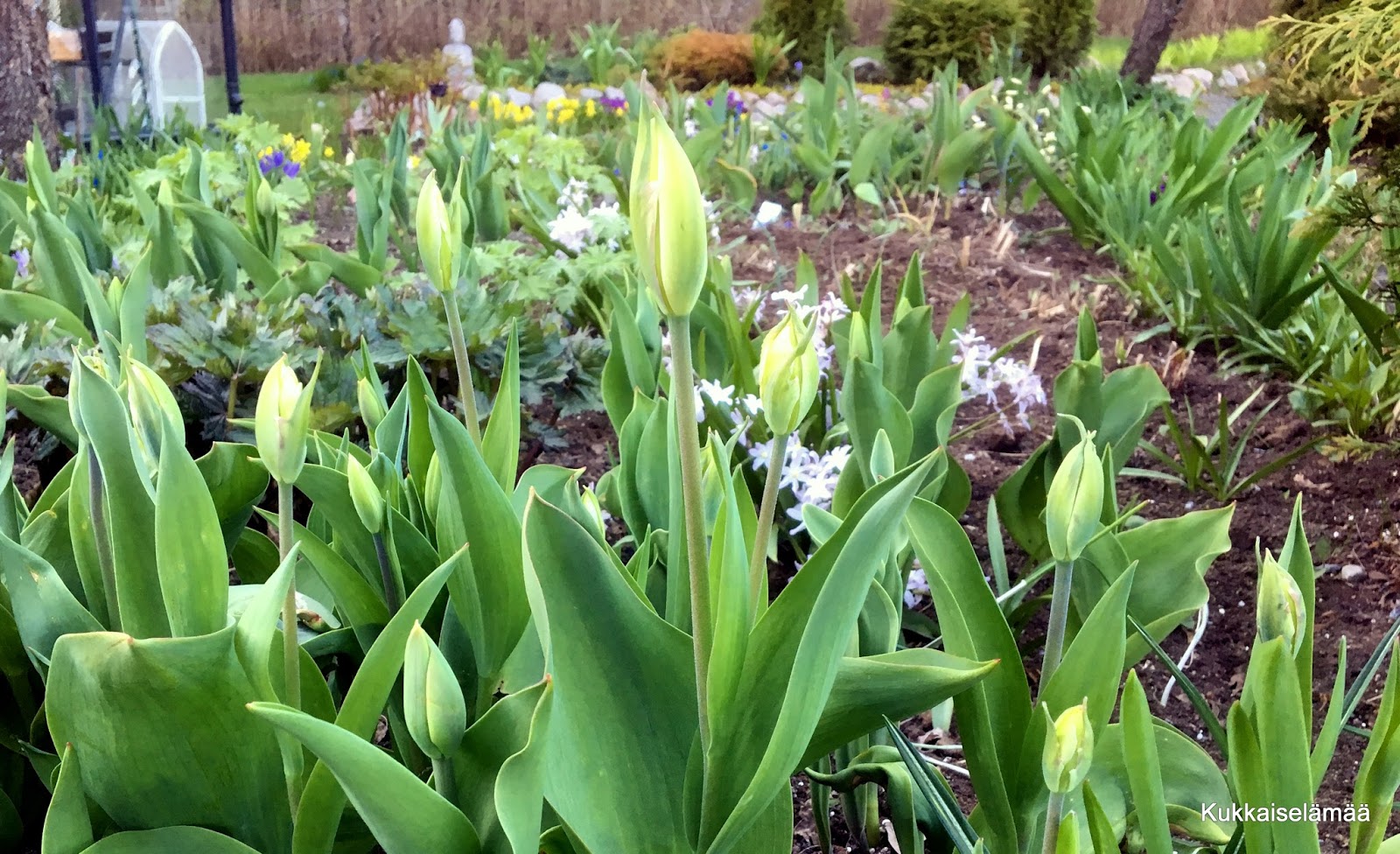 14. Paljon on jo kukassa siellä. Alppikello ei vielä oo tiällä nuppujaan näyttäny. Kaikki kiirehtii nyt kasvuunsa kun on mukavat ilimat.