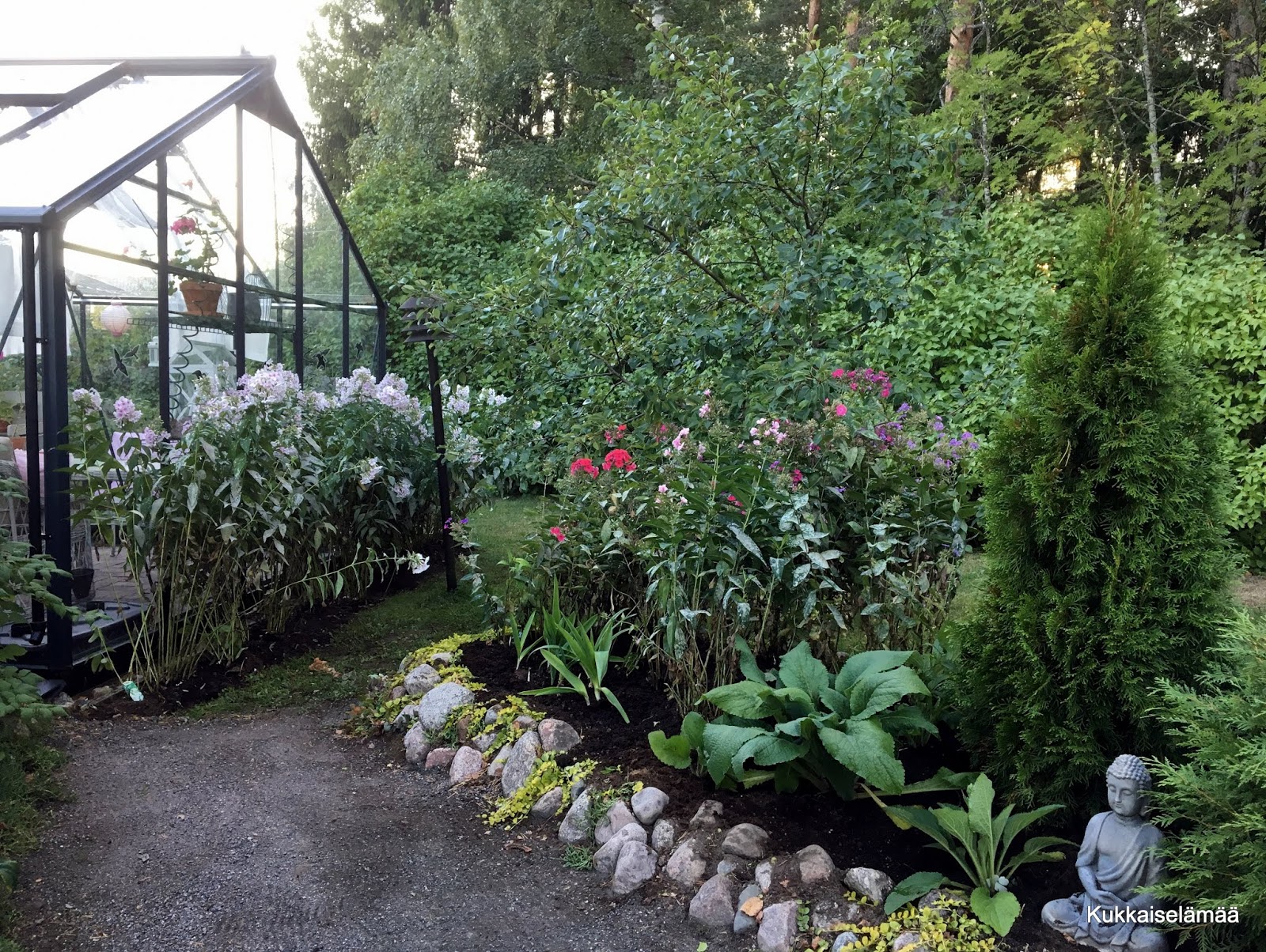 Syysleimut ovat nyt tuossa kasvarin suojissa, mutta paikan pitäisi olla muutoin ilmavampi. Josko tuulenvire ehkäsisi härmältä tulevina kesinä. En lannoita noita leimuja härmän pelossa, mutta joka kesä ovat ihan kamalan näköisiä. Sama juttu toisen penkin leimuilla, jotka pääsivät tuohon tuijien viereen. Härmäilkööt tuossa pihan perillä ihan vapaasti. Kävelen silmät kiinni ohi.