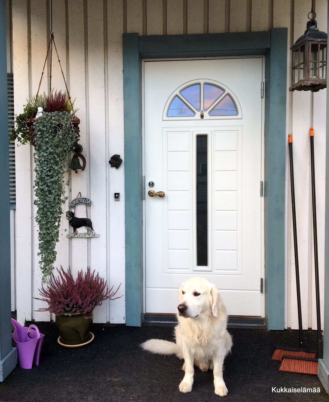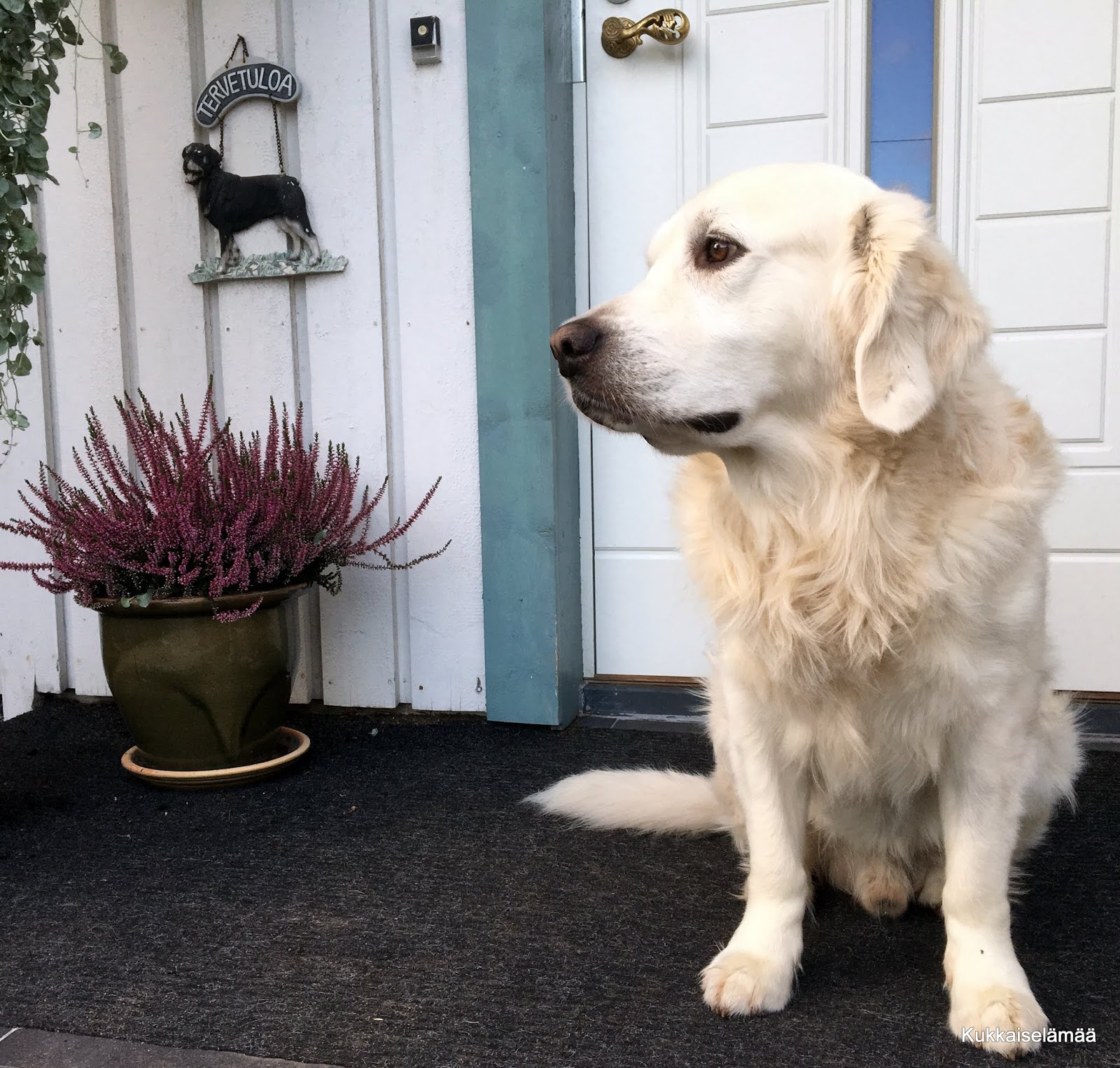 Nyttemmin olen muuttanut pienkerrostaloon ja hoitelen parvekkeen kasveja ja Kukkaiselämää-kauppaa. Mukana menossa on kultainennoutaja Mortti.