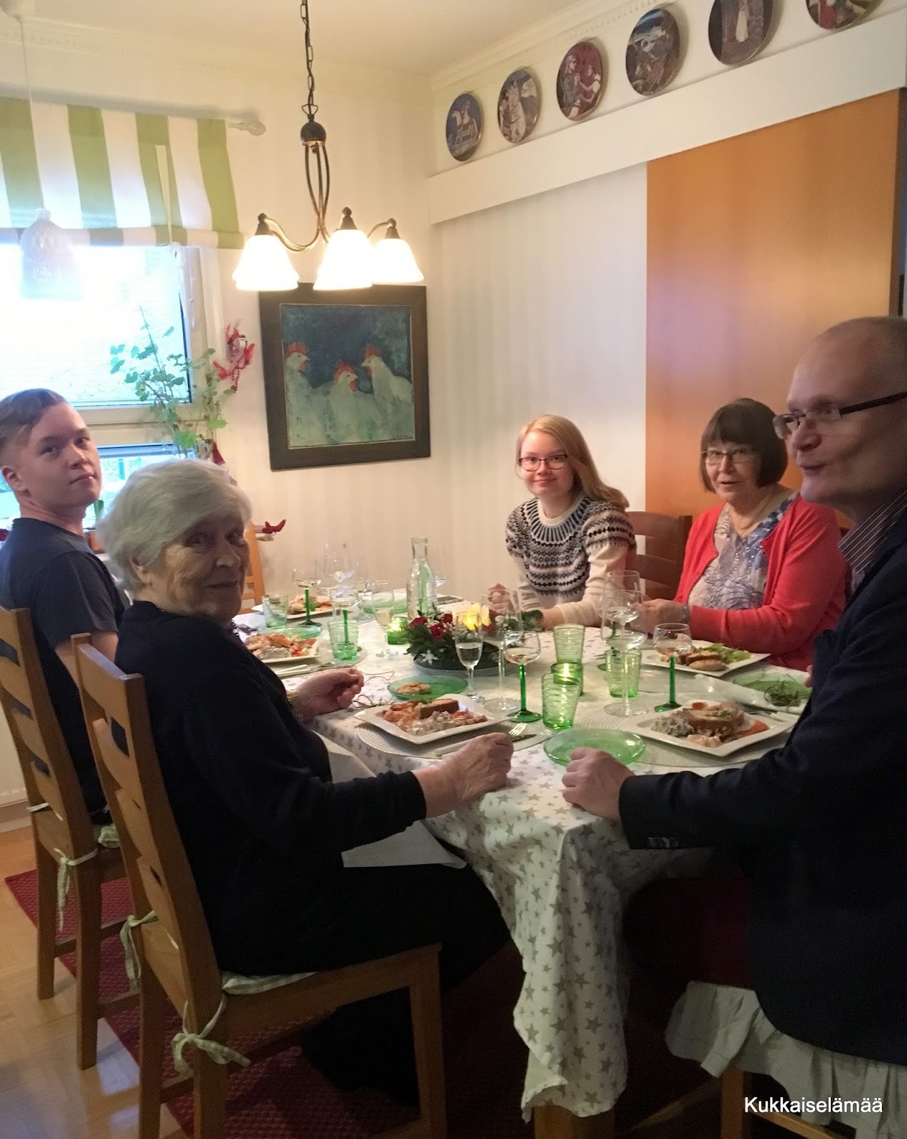 Hei! Jouluaatto meni mukavasti perheen parissa. Äitini ja tätini tulivat meille ja söimme yhdessä jouluaterian. Suurimman osan jouluruuistamme loihti Lappeenrannan Upseerikerhon keittiömestari Ulla Liukkonen. Kyllä oli hyvää. Poika sanoi, että pakko syödä, vaikkei jaksaisi…