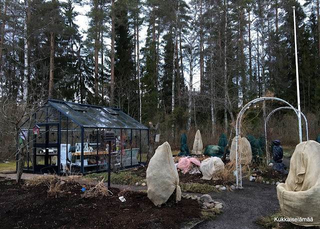 Meillä on havut peitettyinä. Peitin ne tammikuussa, kun ajattelin, että on helpompi peittää ennen lumen tuloa. No, lunta ei koskaan tullut. Maa on kuitenkin enimmäkseen jäässä, joten kaipa suoja havuille on tarpeen.