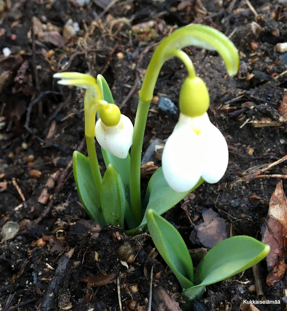 Pari lumikelloa oli kukassa takapihalla.