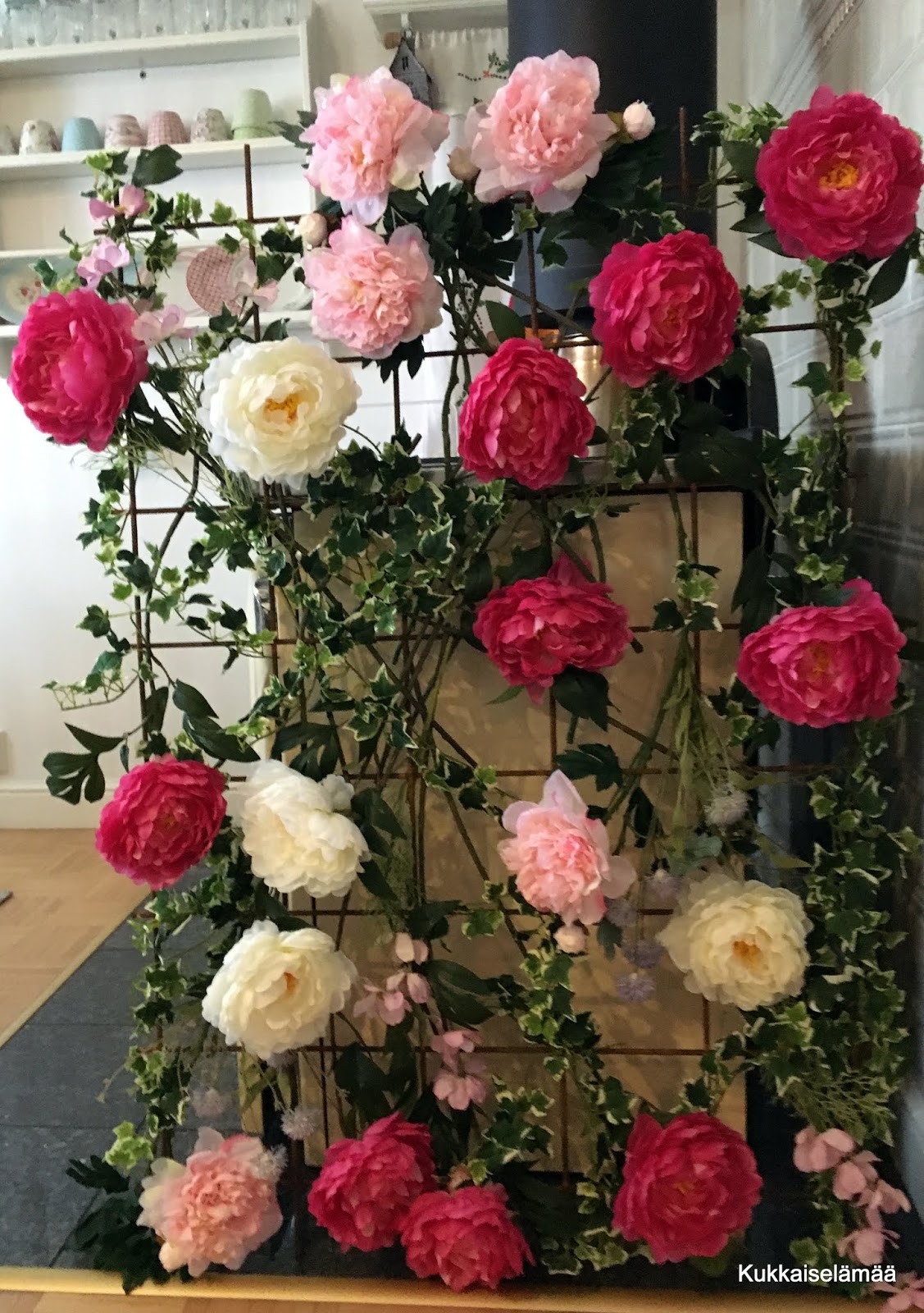 Jos kävisi niin hassusti, ettei tuo korkeudeltaan mahdu Lillevillan kattoon, voi tuon pionihässäkän ripustaa seinällekin. Uskon kyllä, että se mahtuu kattoon. Vaikkapa myyntitiskin yläpuolelle.