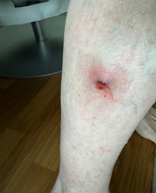Näitä ällötyksiä pitää suihkutella päivittäin. Perjantaina menen terveyskeskukseen polven tikkien poistoon. Olen nyt antibioottikuurilla ja kohta aloitan uuden biologisen lääkityksen haavojen umpeuduttua. Tämmöistä on meikäläisen elo. Siihen lisämausteen tuo tulehtunut akillesjänne ja milloin mitäkin.