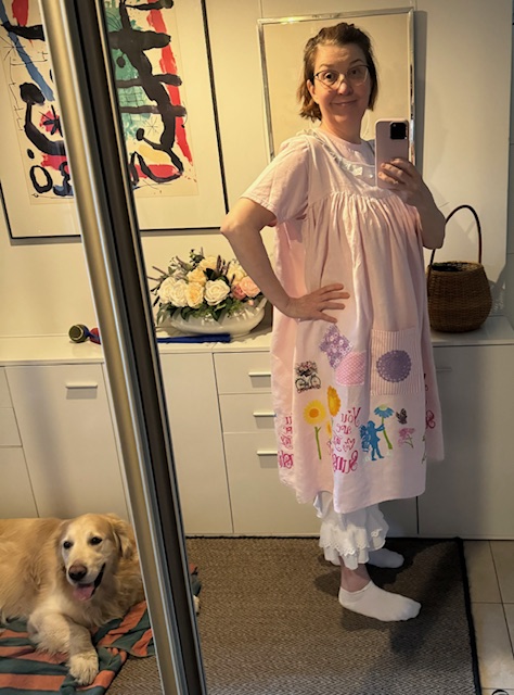 Kuvassa Mortti ja ylläni tänään valmistunut mekko, tai oikeammin liivihame. Maalasin helmaan kangasväreillä kuvioita. Alla on Kukkaiselämää-kaupasta ”mameluukihousut”.