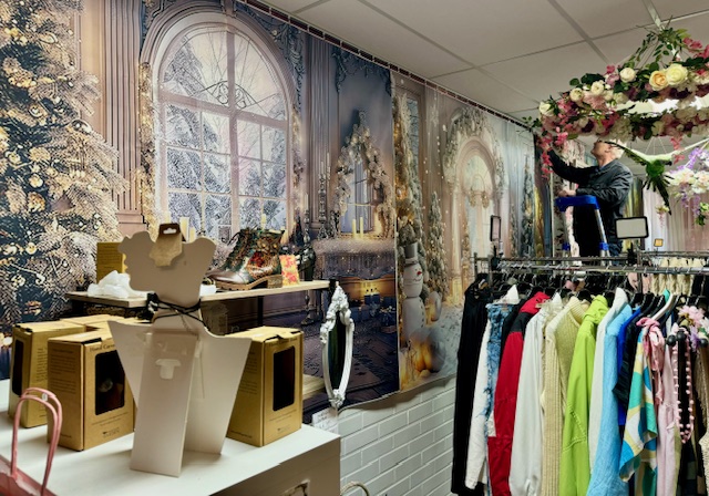 Ulkokukat vaihdoin talvisempiin jo syyskuun lopussa. Samoin seinäkankaat myymälän sisällä. Mies oli tuolloin kotimaassa ulkomaan töiltään apuna.