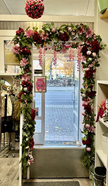 Kukkaiselämää-kaupan jouluilme alkaa olla valmis. Korvasin kuusi isoa, kesäistä kattokranssia joulusilla, samoin oviköynnökset ja tuulikaapin kattokoristeen. Oli siinä hommaa, mutta nyt se on tehty.