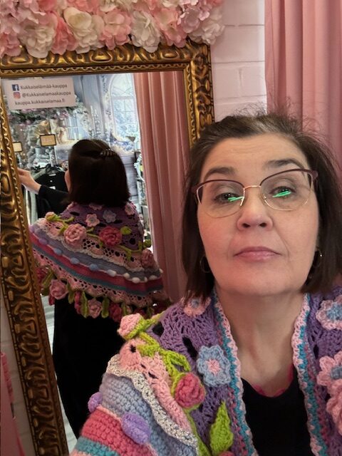 Valmista tuli. Aloin virkata kukkahuivia noin vuosi sitten. Opettelin YouTuben avulla simpukkahuivin virkkausta. Ja kuinkas kävikään? Satumaiseen tyyliin homma lähti käsistä. More is more.