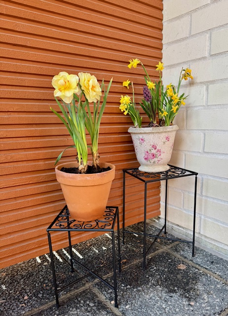 Viime viikolla ostin Lidlistä ruukkujen lisäksi kaksi pientä, metallista ruukkupöytää. Ovat melkoisia rimpuloita. En suosittele. Kuvan saviruukulta puuttuu aluslautanen. Kadonnut muutossa. Täytyy hankkia uusi.