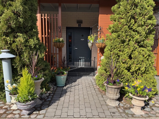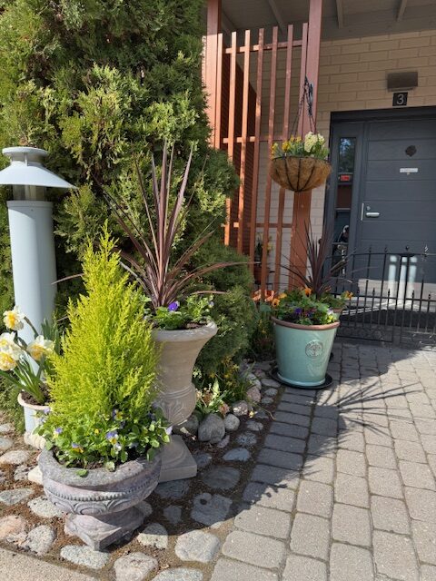 Toiseen ruukkuun istutin raparperin ja muutaman orvokin juurelle. Toiseen verililjan orvokkien kera.