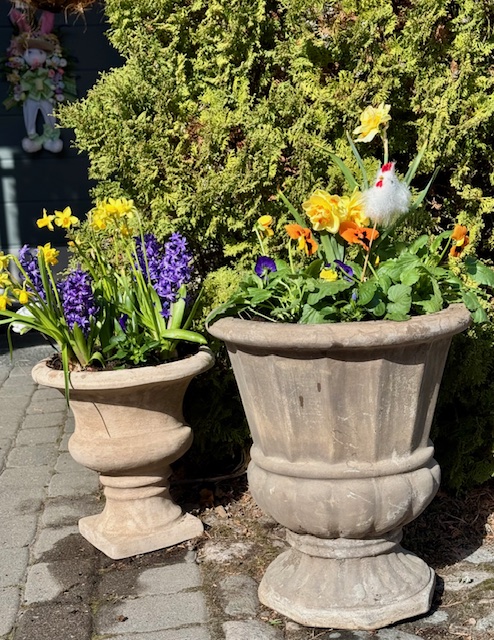 Aurinko paistaa ja ulkona on tosi lämmin. Niinpä porhalsin taimikaupoille ja uusin hieman ruukkuistutuksia etupihalla.