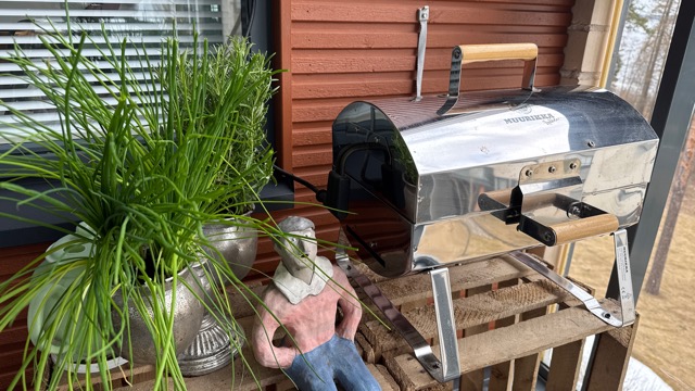 Grillin luo istutin rosmariinia ja ruohosipulia. Saa kokki siitä tuoreita yrttejä.