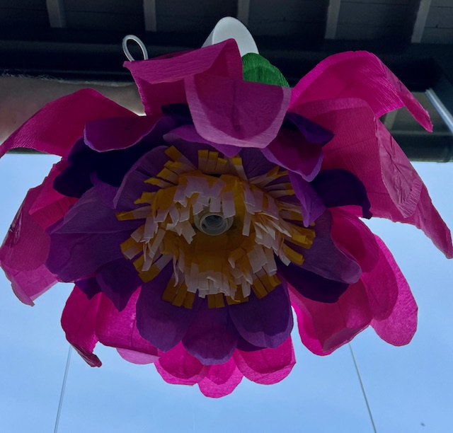 Tein ennen tätä toisenkin valaisimen, asiakastyönä. Asiakas ihasteli Kukkaiselämää-kauppani kreppipaperivalaisimia. Hän toivoi, että teen hänelle myös. Toiveena oli iso ja runsas pinkki-vaaleanpuna-violettisävyinen. Asiakas sanoi tuovansa tarvikkeet. Sanoin, että mikäli hän haluaa ison valaisimen, tulee hänen tuoda pitkää kreppipaperia. Muutoin homma ei onnistu.