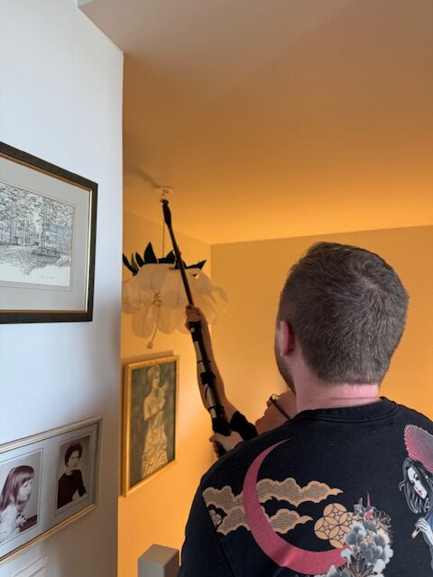Valaisimen paikka on tosi haastava. Tarvittiin mieheni kekseliäisyyttä, että saimme valaisimen paikoilleen. Mitkään tikkaat eivät alakerrasta yllä tuohon.