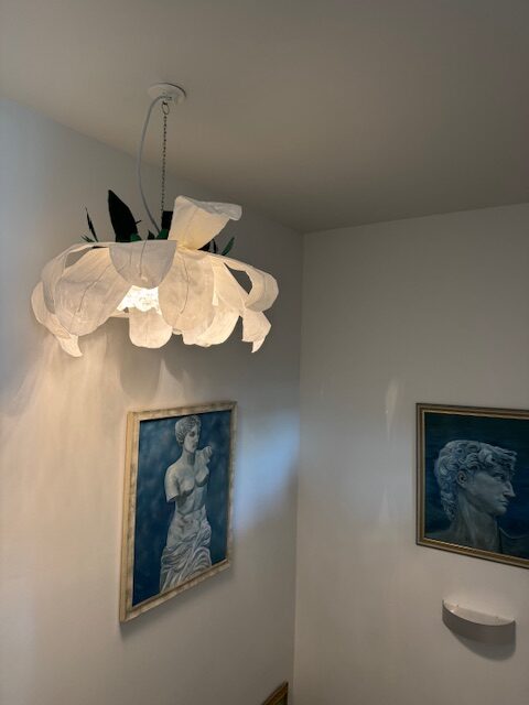 Kun asiakas tuli noutamaan valaisimen, hän ei peitellyt pettymystään. Ei ollut riittävän iso. Miksiköhän? Sanoin, että toivoin nimenomaan pitkää kreppipaperia, jotta voin tehdä isokokoisen valaisimen. Asiakas oli tietoisesti valinnut lyhyttä, koska se on vahvempaa. Mitä tuohon voi sanoa?