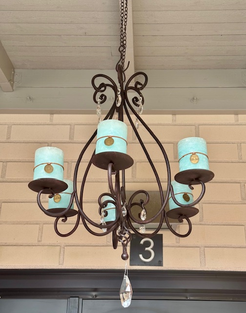 Tuunattiin kynttelikköä kristallein, mutta vielä ostan kuusi lisää. En huomannut, että kerroksia on noin monta tässä kynttelikössä. Kynttilät otin oman Kukkaiselämää-kauppani hyllystä.