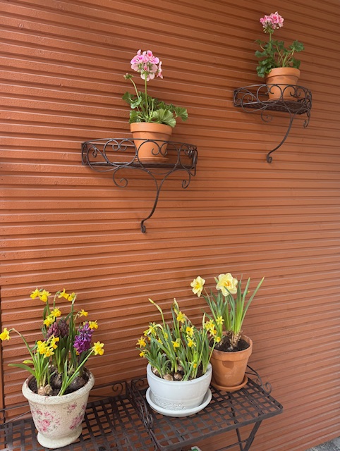Seinähyllyt saivat pelargoniat saviruukkuineen. Pöydille asettelin ruukkuja, joista jokainen on sattumoisin erilainen. Pöydissä on alahyllyt, joita en kuvannut, koska niissä on nyt säilytyksessä vähemmän kauniita, tyhjiä amppeleita ja pussi kanankakkaa.