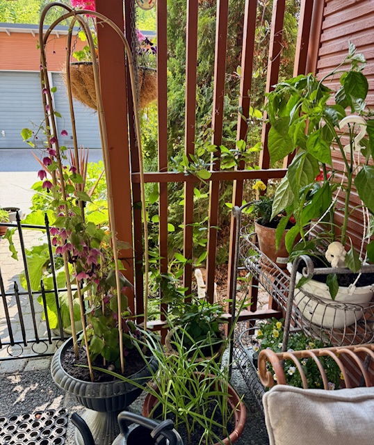 Yläkerran parvekkeella viihtyvät vain varjon kasvit. Ruukuissa on verililjoja, muratti ja silkkihurmeheinää.