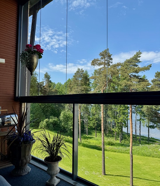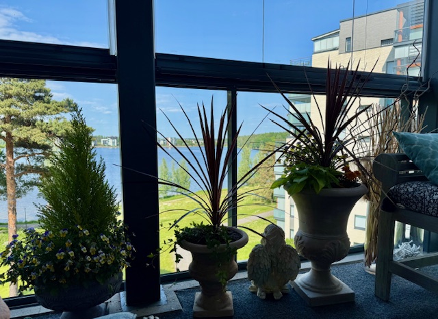 1. Kiitos postauksesta. Sinulla on kaunis piha ja parveke, terassikin myös kerrostalokodissa. Teiltä on hulppeat näkymät lahden yli Tyysterniemeen asti.