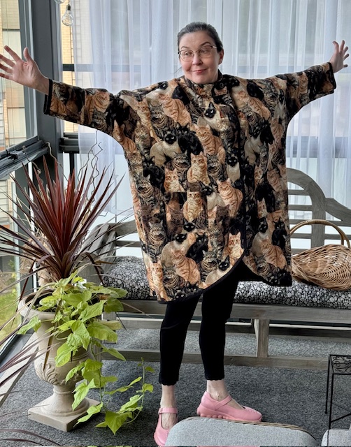 Ompelukone on laulanut oikein urakalla viime aikoina. On syntynyt erinäisiä haalareita ja Kukkaiselämää-malliston ensimmäinen takki. Kun näin kissa-aiheisen gobeliinikankaan paikallisessa kangaskaupassa, alkoi päässä raksuttaa. Raksutuksen tuloksena syntyi takki.