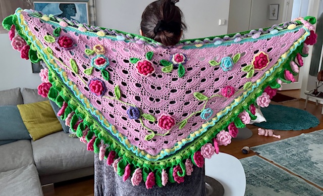 Huivihommia. Tällainen ruusuhuivi valmistui myyntiin Kukkaiselämää-kauppaan.